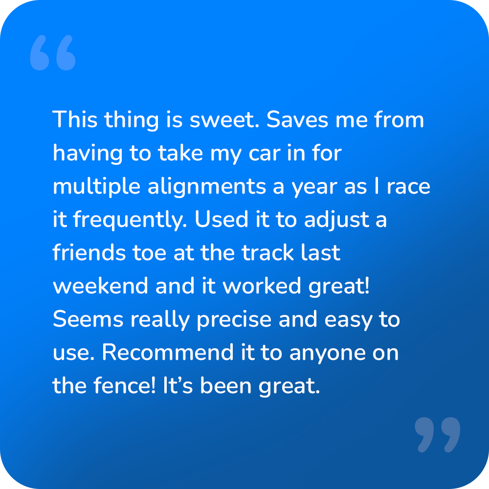 Tested against professional-grade alignment equipment, Gyraline DIY achieves total toe accuracy of ±0.020°—surpassing the industry’s ±0.050° benchmark. With front and rear toe measurements nearly identical to a calibrated stationary alignment machine, you’ll get pro-level results you can trust.